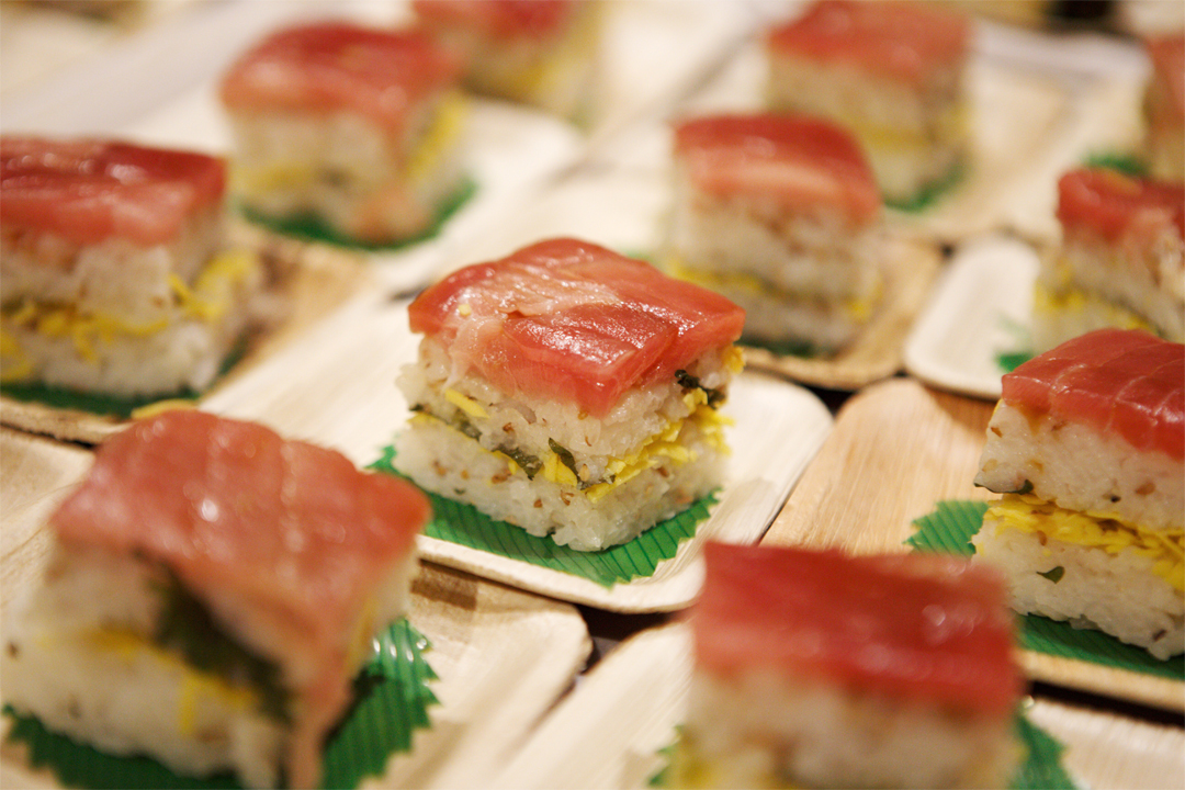 上映中は、鮒ずしを使用した色鮮やかな押し寿司が各座席に運ばれ、上映後のアフターパーティーでは、琵琶湖で獲れた天然のニゴロブナを原料にした「ふなずし」(薫彩堂/くんさいどう)と、全国でも類を見ない山廃仕込と木槽天秤しぼりで作られた日本酒(上原酒造「不老泉」)を提供し好評を得ました。